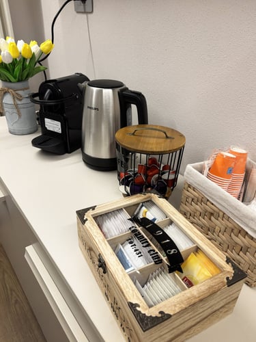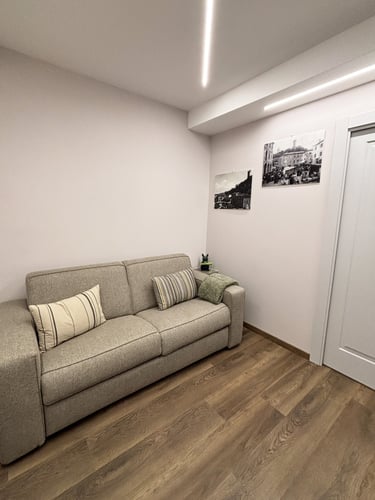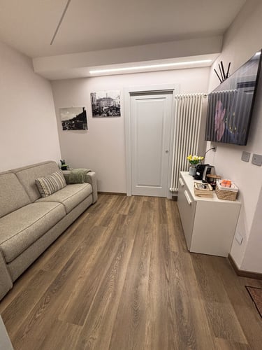 La camera è dotata di una confortevole camera da letto matrimoniale e di un piccolo soggiorno, completo di un divano letto matrimoniale, ideale per momenti di relax. Potrai gustare un caffè preparato con la macchina Nespresso o un tè dal bollitore elettrico, grazie all'angolo ristoro attrezzato. Il frigobar è a tua disposizione per conservare le tue bevande preferite.
