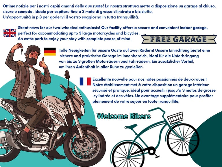 Lavanderia a Gettoni, Tabaccheria, Bar, Pasticceria e Ristoranti per gustare piatti tipici della cucina locale, perfetti per una cena dopo una giornata di esplorazioni. Novità : Offriamo un comodo garage per moto e biciclette, per la massima sicurezza dei tuoi mezzi. Da sapere : è vietato organizzare feste o eventi , nella struttura non sono ammessi animali domestici.